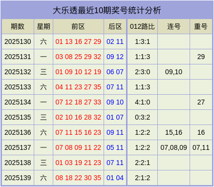 后区分析:上期开出后区01、04,最近10期的后区奇偶比为15:5,本期关注【奇偶】数后区,看好后区号码:07、10。