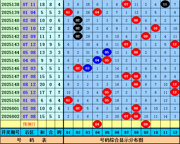 后区分析:后区上期开出号码07和08,分别遗漏4期和0期,目前后区01-12区间冷温热号码个数比为3:3:6,本期后区注意号码04+09。