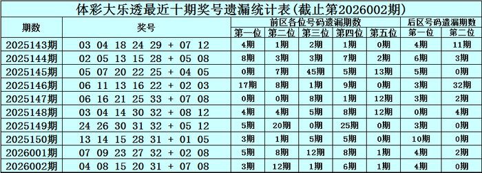 第2026002期奖号:04 08 15 20 31 + 07 08 ,各位号码遗漏期数为:3期、12期、1期、6期、1期 + 4期、0期。