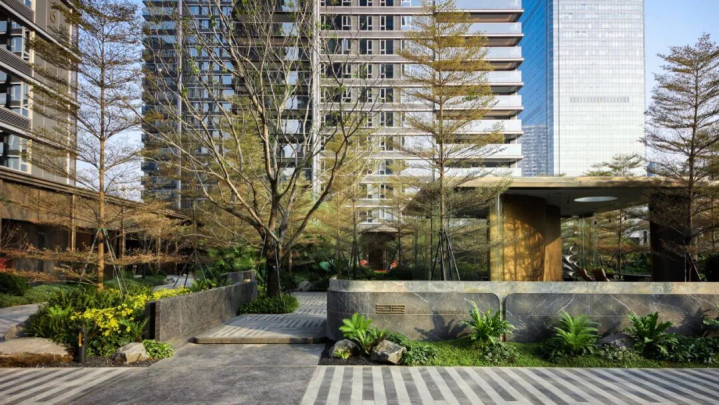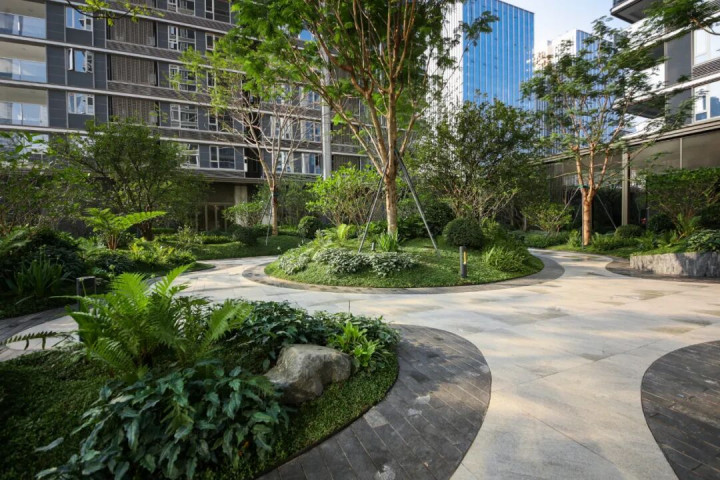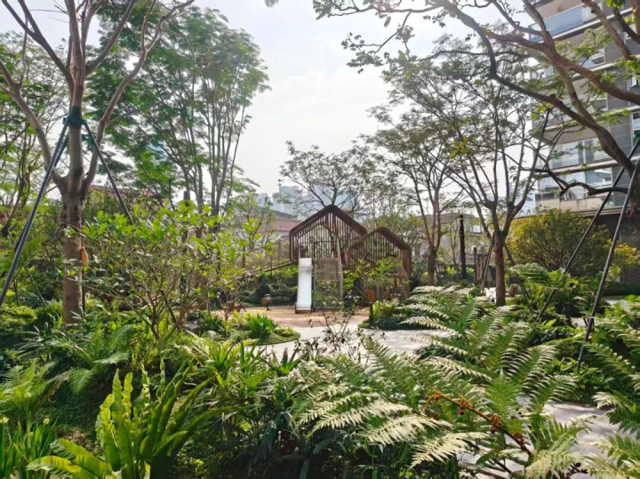 小区内部,分区设有不同的主题园林和主题架空层,其中不乏凤凰木、黑松等名贵树木。