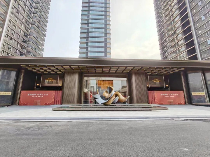 其中,社区入口大门高约8米、长约66米,入口处还设有张代松老师的雕塑“潮涌向前”。穿过入口大堂和高10米的水帘之后,通过电梯才正式进入社区花园,仪式感拉满。