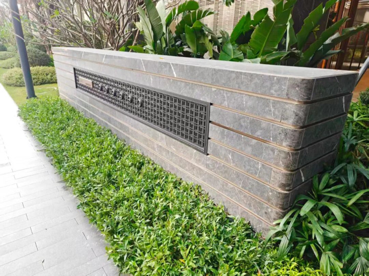 整个小区呈现出高端大气的格调,不仅消防栓、指示牌等细节均采用统一的设计语言,就连空调外机的金属格栅也巧妙融入了专属的“玺”字纹样。