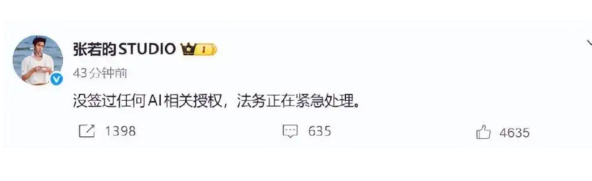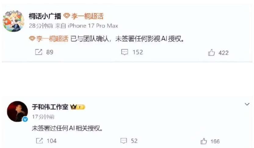 张若昀工作室率先发声:“没签过任何AI相关授权,法务正在紧急处理。”紧接着于和伟、王楚然、李一桐纷纷否认。有律师指出,这种“先宣布再补票”的操作,触碰了肖像权和人格权的法律红线。