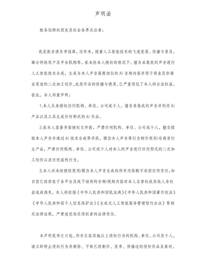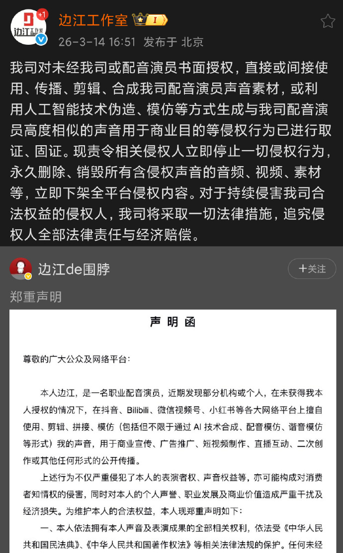 配音演员早已“炸”了。2026年3月,季冠霖、边江工作室等集体发布维权声明。大量AI平台擅自抓取配音作品,用于AI模型训练,再将克隆声音用于短剧配音、广告播报、有声书录制等商业场景。底层配音演员天然处于保护盲区——他们的声音在专业圈子里辨识度极高,但在法律意义上却“不够有名”。有从业者在社交媒体上写道:“声音被盗了,但我证明不了那是我的。”