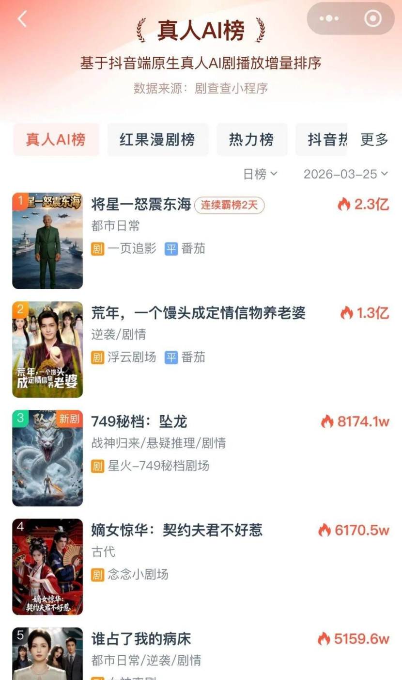AI影视的扩张速度,比任何人预想的都快。截至2026年1月,AI仿真人短剧在主流短剧综合榜单中的占比已达38%,较上年的7%大幅跃升。